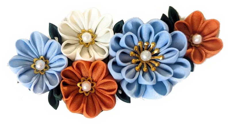 Nach der traditionellen Tsumami-Kanzashi-Technik falte und füge ich die Seidenstücke zu Blüten — und montiere sie auf Haarnadeln, Broschen und Ohrringe.